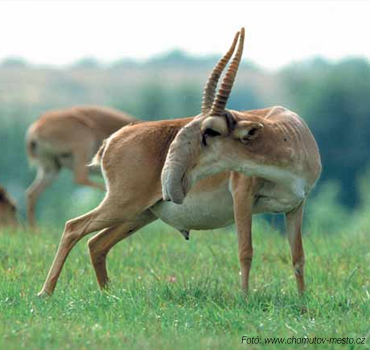 The saiga (Saiga tatarica) is a critically endangered antelope which originally inhabited a vast area of the Eurasian steppe zone from the Carpathian Mountains and Caucasus into Dzungaria and Mongolia. It is currently critically endangered.